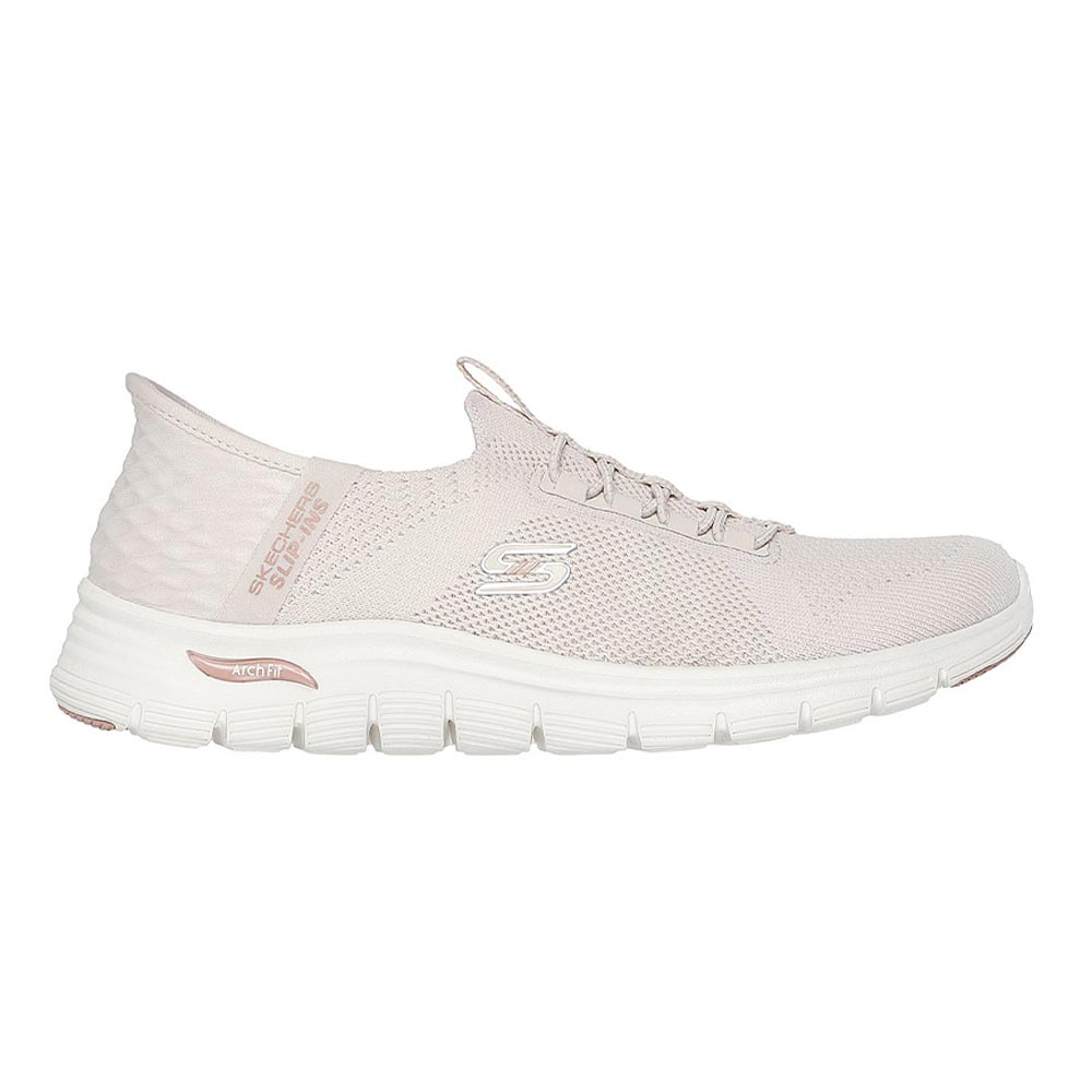 Simply step in and go wearing Skechers Hands Free Slip-ins®: Arch Fit® Vista - Aspiration. Designed with our Exclusive Heel Pillow™, this vegan design features an engineered knit upper with stretch laces and a removable Arch Fit® insole.